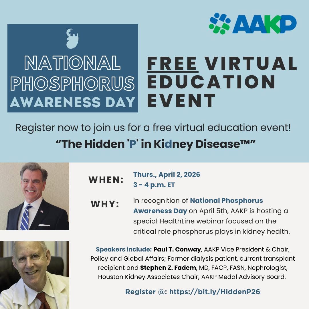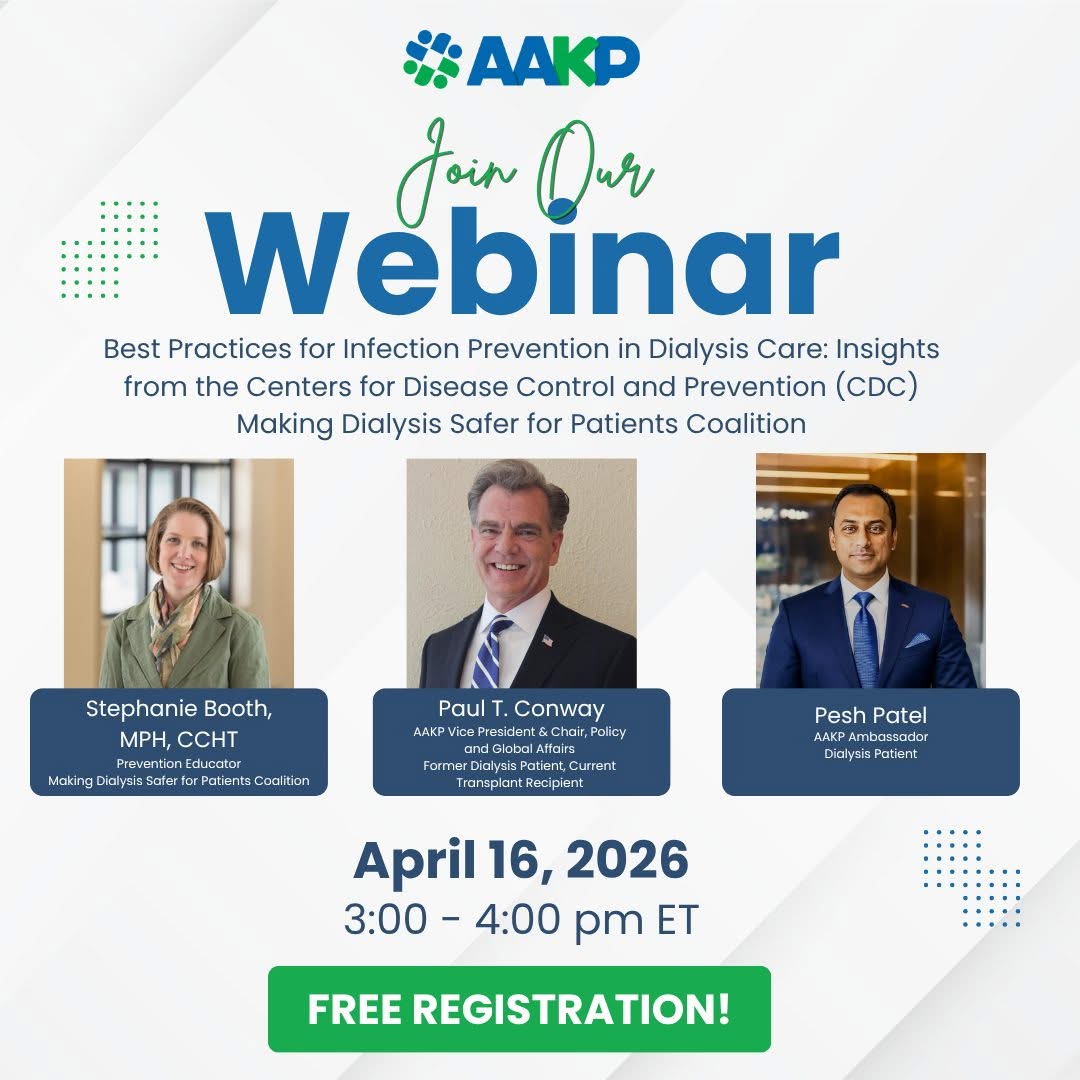 As the oldest and largest independent kidney patient organization in the U.S. with an expanding global reach, AAKP is dedicated to improving the lives and long-term outcomes of kidney patients through education, advocacy, patient engagement, and the fostering of patient communities.