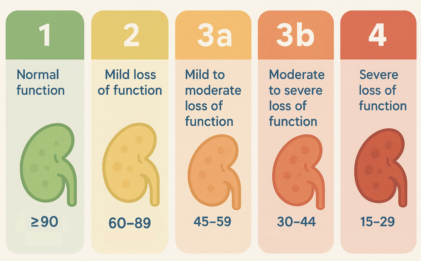 | eGFR | 90-120 mL/min | Stage 1:90mL/min Stage 2: 60-89 mL/min Stage 3a:45-59 mL/min Stage 3b: 30-44 mL/min Stage 4: 15-29 mL/min Stage 5: 15 mL/min |